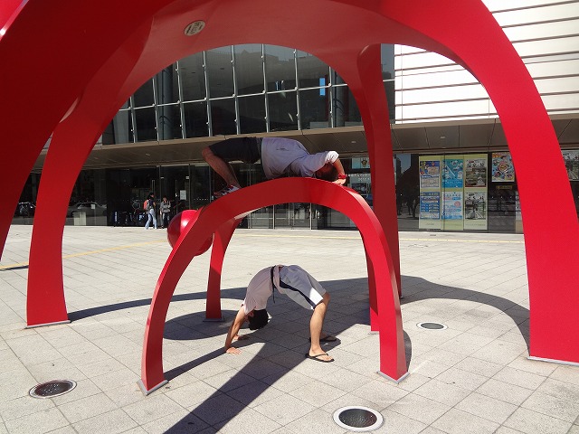 カップル用のベンチでふざけるこの二人