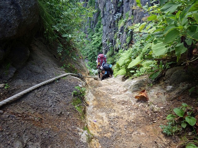 観音岩の難所、ロープで登ります。