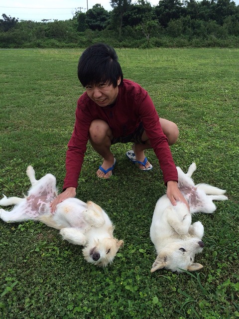 犬二匹と遊ぶこうきさん。